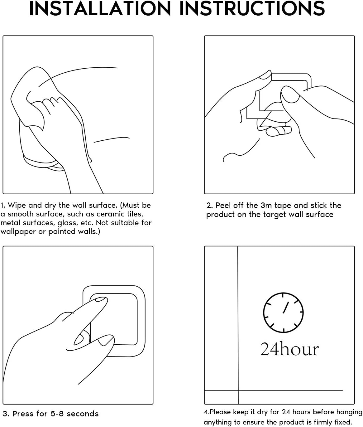 جنس: قلابهای خودچسب از استیل سنگین مات و یا با روکش رنگ مشکی ساخته شدهاند. که به قلاب لباس حس شیک و زیبایی میدهد و میتواند کاملاً با سبکهای مختلف دکوراسیون مانند حمام، اتاق خواب، آشپزخانه، دفتر و غیره هماهنگ شود. برای سطوح صاف مانند شیشه، سنگ مرمر، کاشی و غیره مناسب است. (لطفاً هنگام استفاده روی دیوارهای گچکاری شده و رنگ شده مراقب باشید)