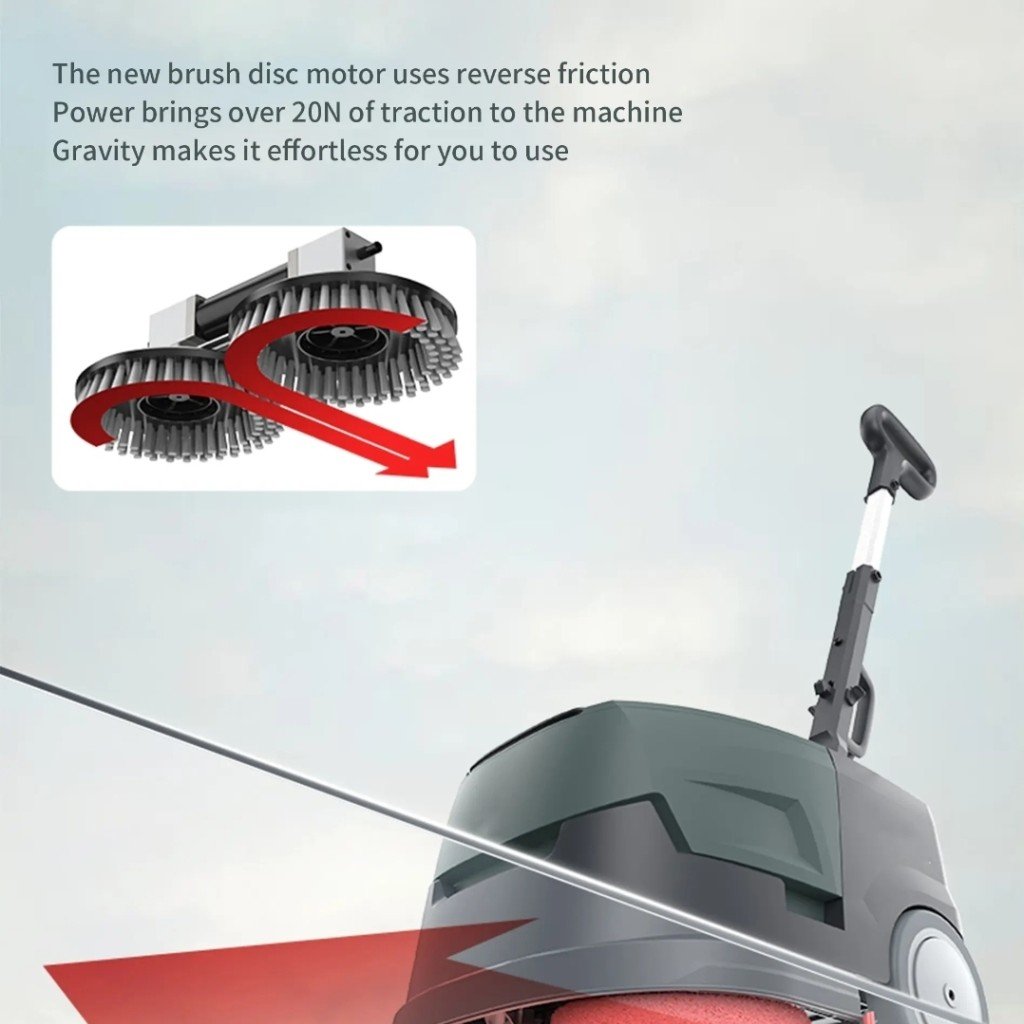 ابعاد 42x43 و ارتفاع با دسته 108 سانتیمتر است که جزو کوچک ترین دستگاه های اسکرابر کفشوی حرفه ای است و وزن خالص آن 10 کیلوگرم است.