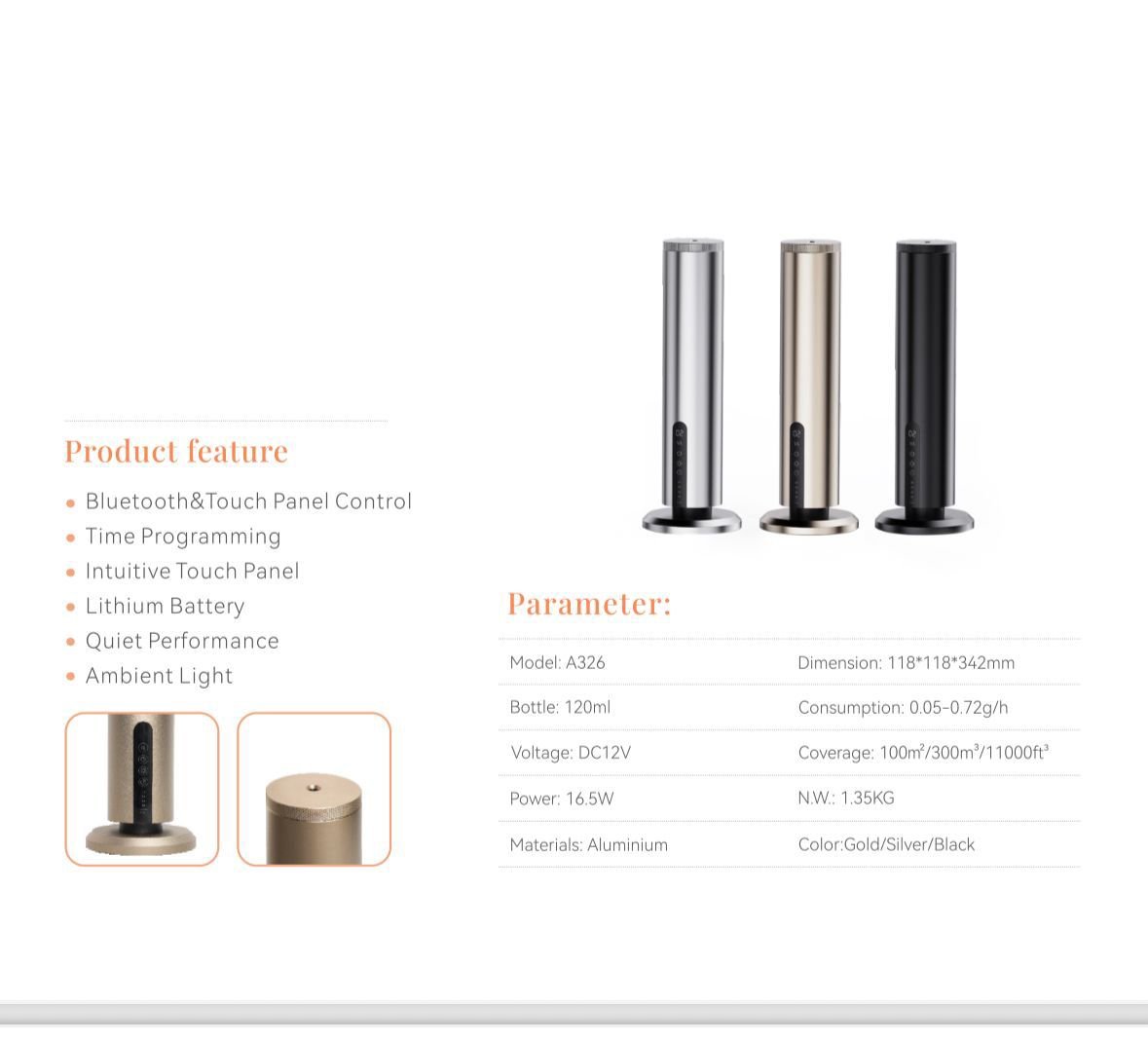 خشبو کننده هوا هوشمند لوکس L3 با قرارگیری در بر روی میز ظاهر زیبا و شکیلی دارد و میتوان آن را میتوان بدون سیم استفاده نمود. مخزن این دستگاه با یکبار شارژ حدود یکماه کار کند و میتوان آن را از طریق اپلیکیشن موبایل نیز زمان روشن و خاموش شدن دستگاه را تنظیم نمود.